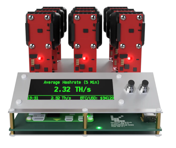 Featuring a Raspberry Pi Zero W 2 controller, complete with integrated Wi-Fi and Ethernet, this hub guarantees swift setup and effortless configuration. Its vibrant green-on-black OLED screen and specialized mining software simplify monitoring and setup procedures.